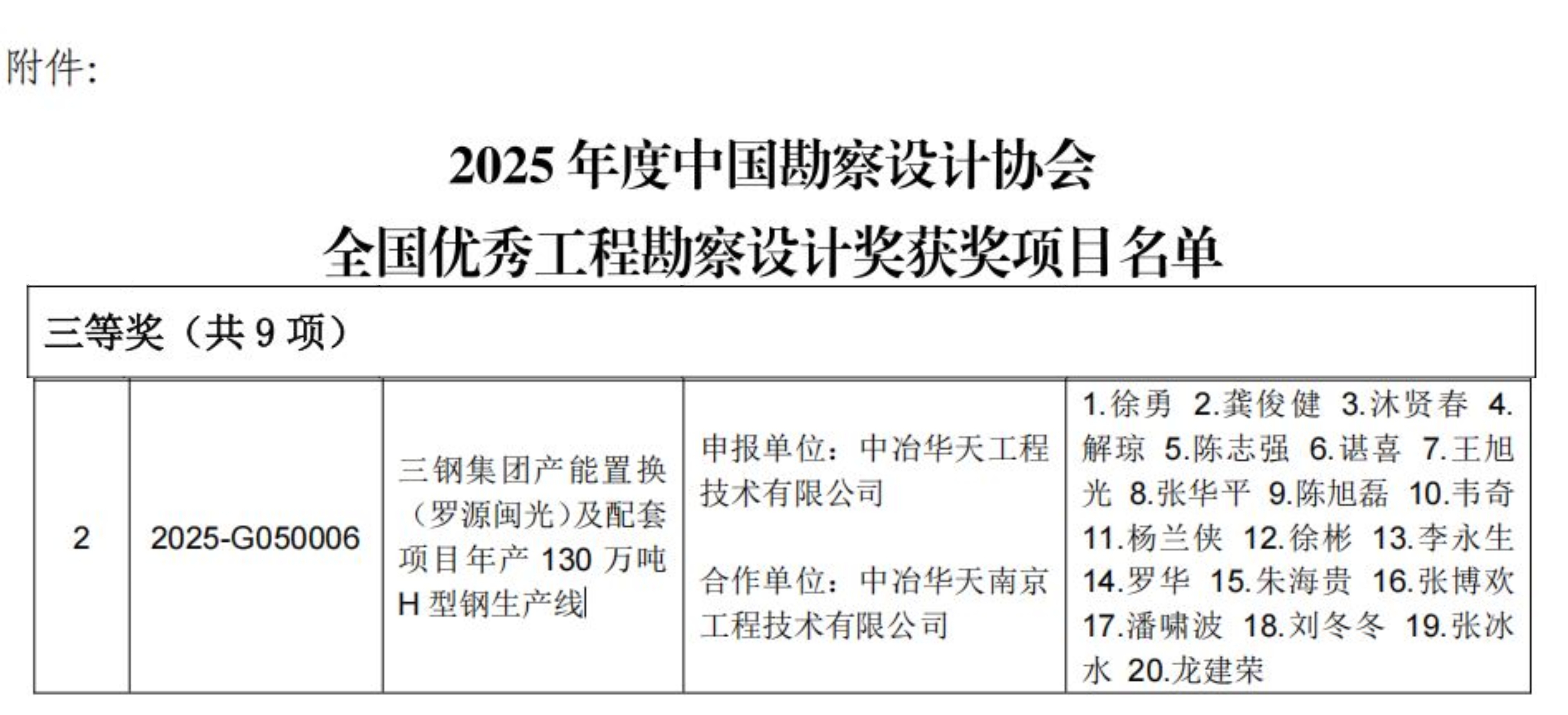 近日,2025年度中國勘察設(shè)計協(xié)會全國優(yōu)秀工程勘察設(shè)計獎評選結(jié)果正式公布,中冶華天參賽項目《三鋼集團(tuán)產(chǎn)能置換(羅源閩光)及配套項目年產(chǎn)130萬噸H型鋼生產(chǎn)線》榮獲冶金工業(yè)工程設(shè)計三等獎。這是該項目繼全國冶金行業(yè)工程設(shè)計優(yōu)秀成果一等獎后再度斬獲國家級獎項,集中彰顯了中冶華天在工程勘察設(shè)計領(lǐng)域的創(chuàng)新技術(shù)優(yōu)勢與深厚設(shè)計能力,也體現(xiàn)了行業(yè)協(xié)會高度肯定公司在高水平行業(yè)競爭中的卓越實力與領(lǐng)先地位。
