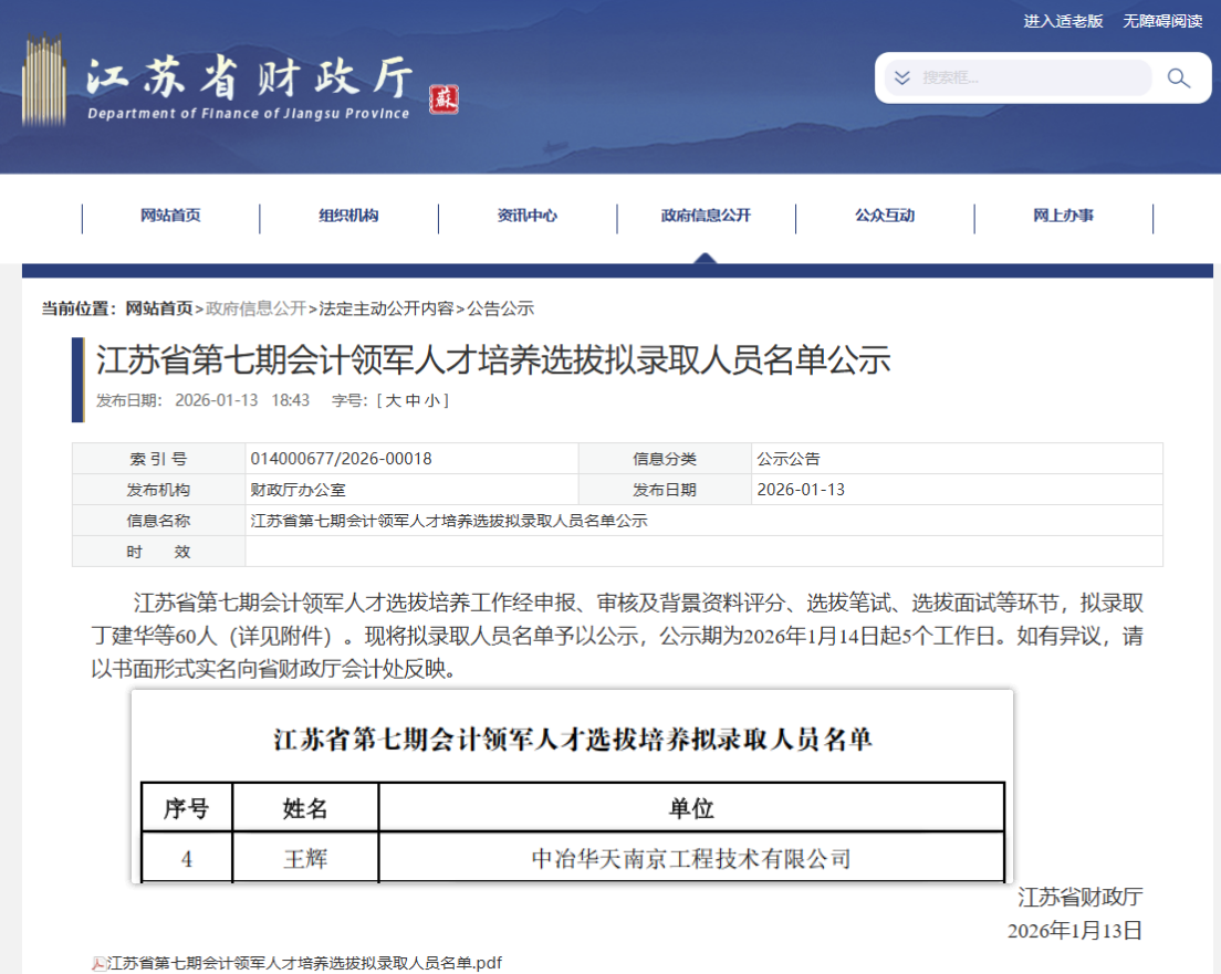 1月13日,江蘇省財政廳公布“江蘇省會計領(lǐng)軍人才”(第七期)擬錄取人員名單。經(jīng)過申報、資格審核、背景評分、筆試與面試等多輪嚴格選拔,中冶華天財務(wù)管理部王輝從全省央國企、上市公司、三甲醫(yī)院、高等院校、獨角獸企業(yè)等各類重點單位的優(yōu)秀財務(wù)負責人及總會計師群體中脫穎而出,成功入選,再次彰顯了華天財務(wù)人員的專業(yè)實力與業(yè)務(wù)素養(yǎng)。